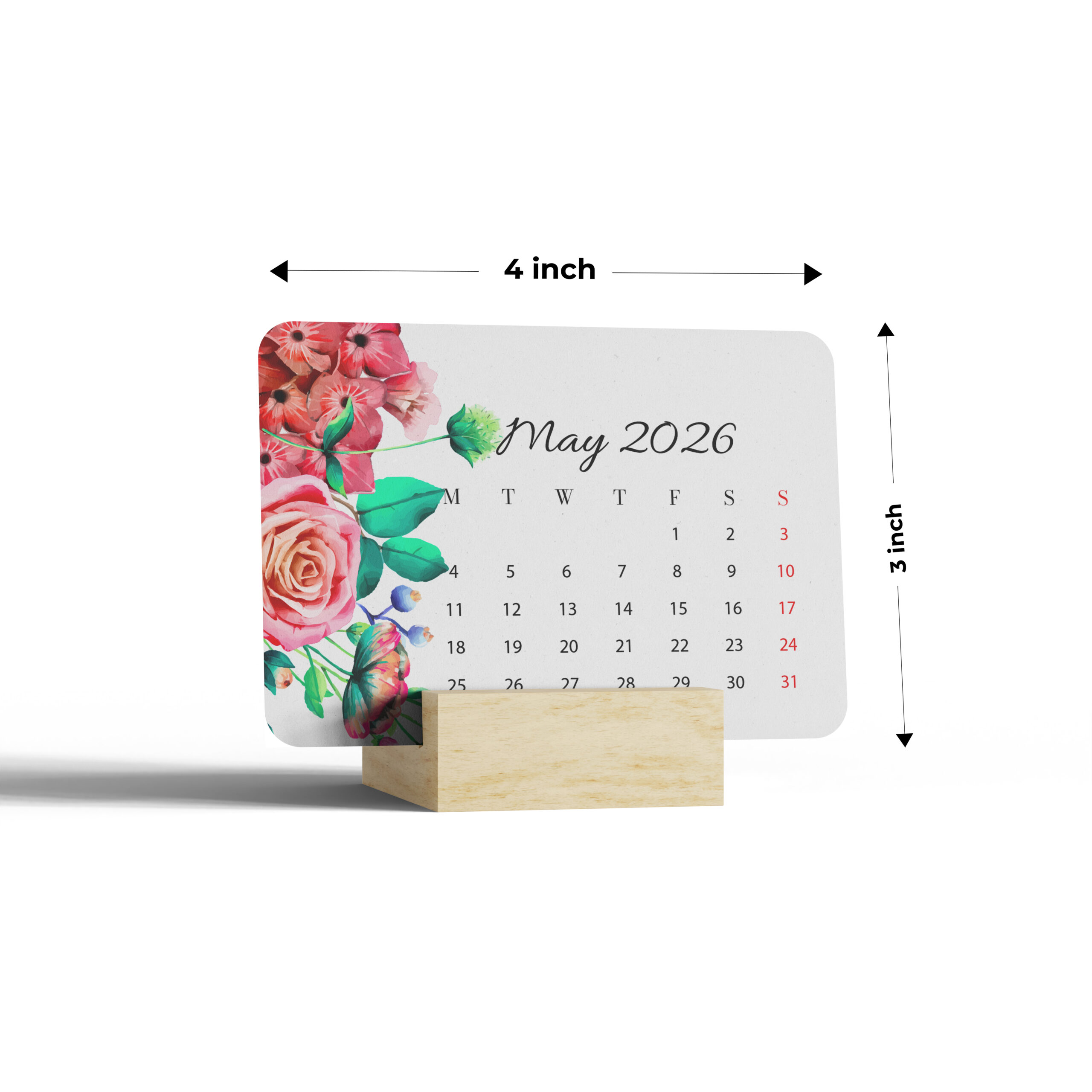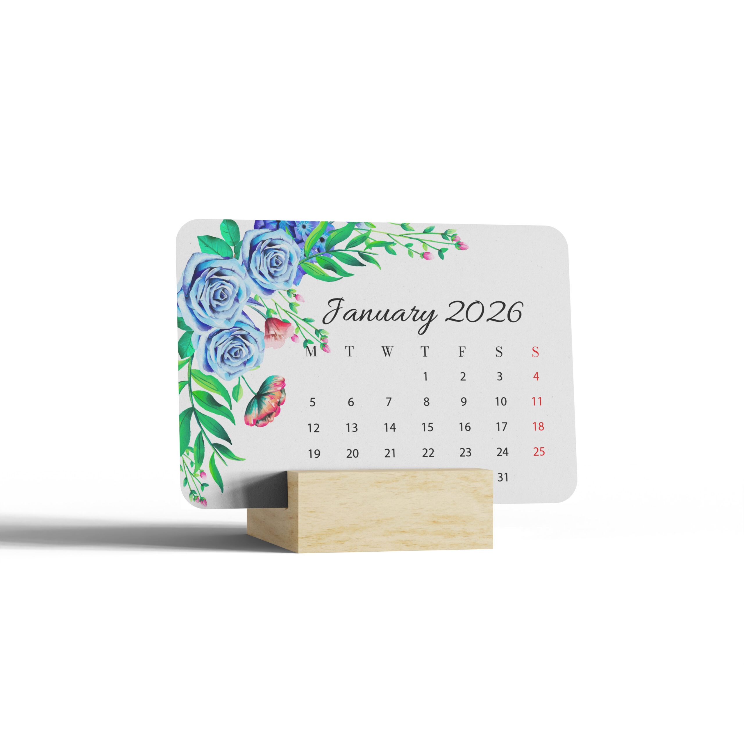 Elevate your desk organisation with this charming mini calendar for 2026. Featuring elegant watercolour artwork with delicate blue roses, emerald foliage, and whimsical butterflies, this compact calendar measures 10.16 cm x 7.62 cm, making it perfect for any workspace. The calendar cards rest beautifully on a natural wooden stand, adding a touch of sophistication to your desk setup. Each month displays clear date formatting with weekends highlighted in red for easy reference. The pristine white background enhances the stunning floral design while maintaining excellent readability of the dates. Perfect for keeping track of important dates while adding a decorative touch to your home office, work desk, or study area. The thoughtful design combines functionality with artistic beauty, making it an ideal accessory for planning your year ahead while maintaining a stylish desk aesthetic.