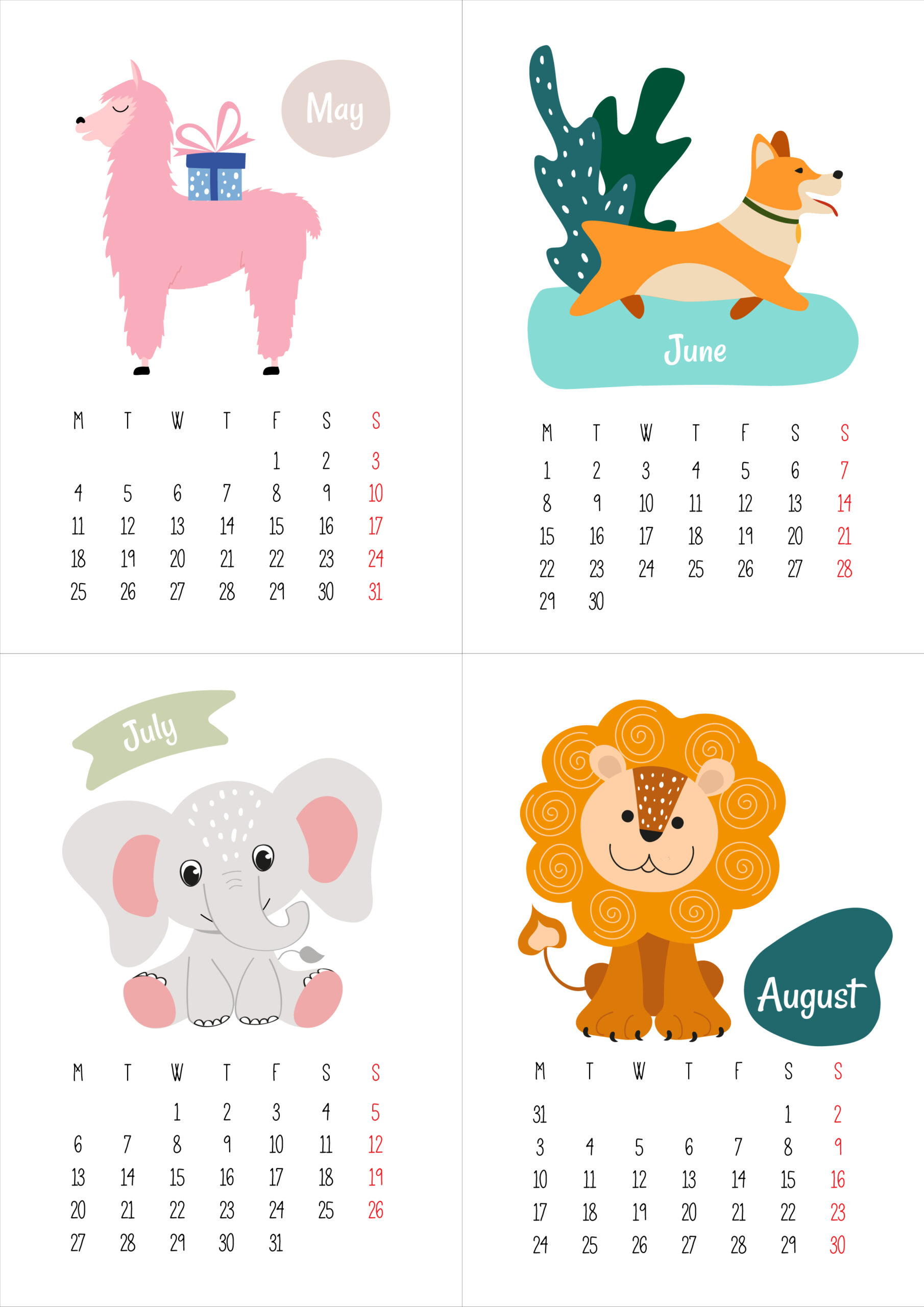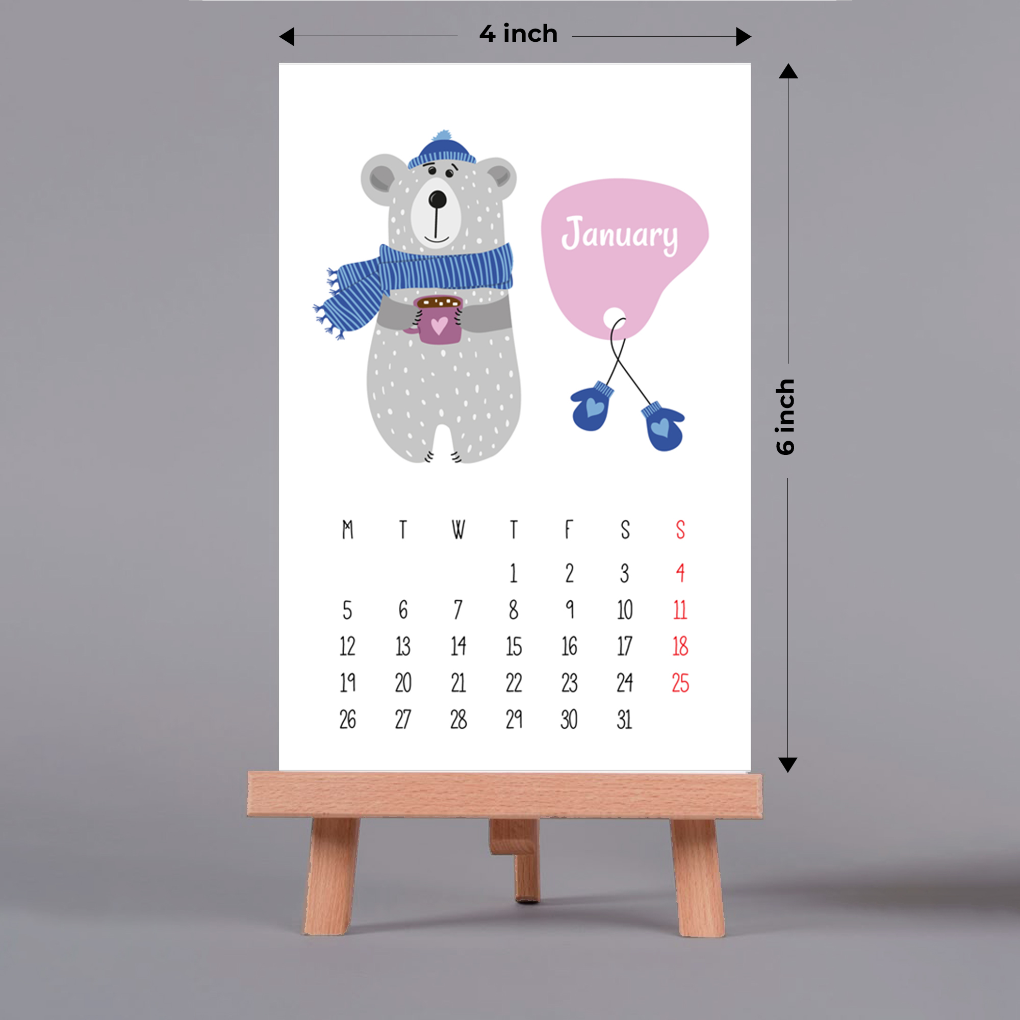 Add a delightful touch to your workspace with this charming 4 x 6 inch mini desk calendar featuring adorable hand-drawn animal illustrations. Each month showcases a different whimsical character – from a cosy polar bear in winter wear to a playful corgi and a majestic lion – all rendered in a sweet, contemporary style with soft colours. The calendar comes with a sturdy wooden desktop stand that provides perfect visibility at a comfortable angle. Ideal for small spaces like study tables, office desks, or bedside tables, this compact calendar measures 4 inches by 6 inches. The clean, well-organised date grid makes it easy to track your schedule while the endearing artwork brings a smile to your face throughout the year. The high-quality paper ensures clarity of both the illustrations and text. Perfect as a thoughtful gift or a personal organisational tool, this vertical desk calendar combines functionality with delightful artistic charm.